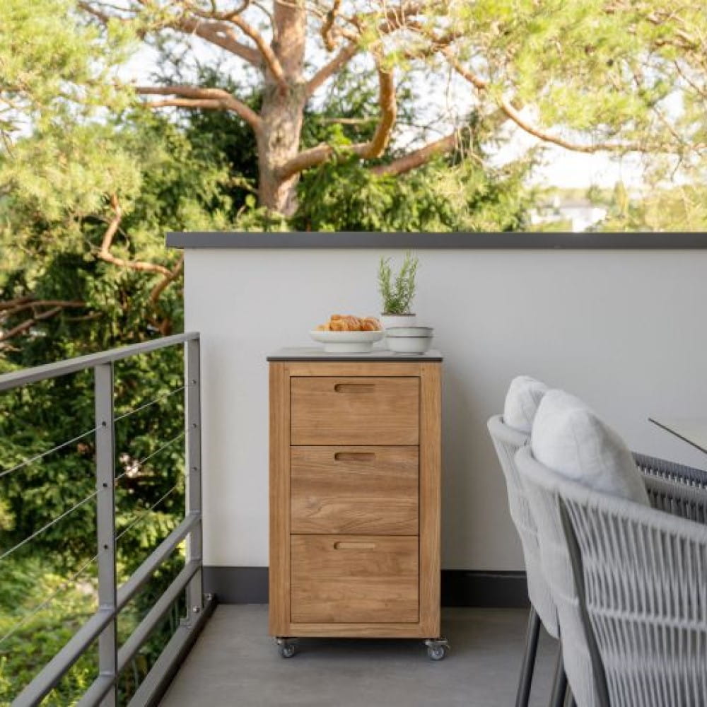 ELMA Sideboard ogrodowy wykonany z drewna teakowego z trzema szufldami. Doskonały do przechowywania najpotrzebniejszych rzeczy.  Blat SilverStar 2.0