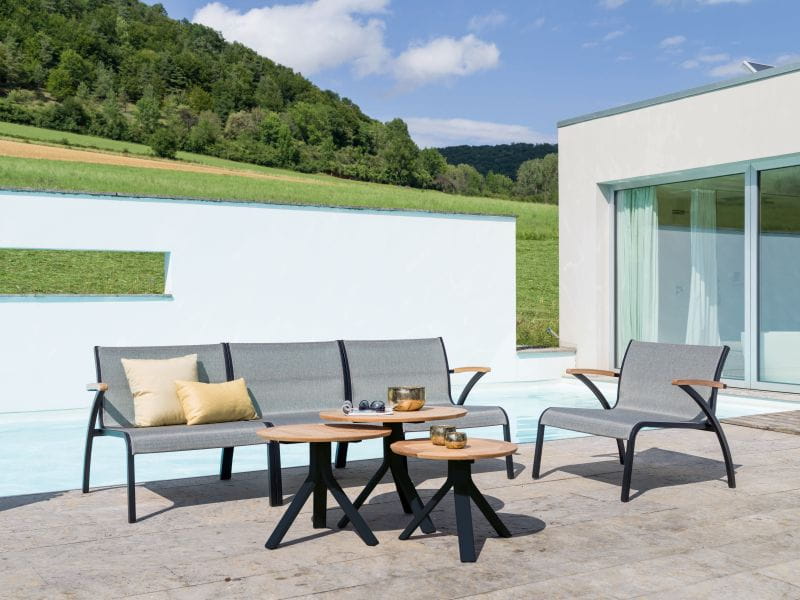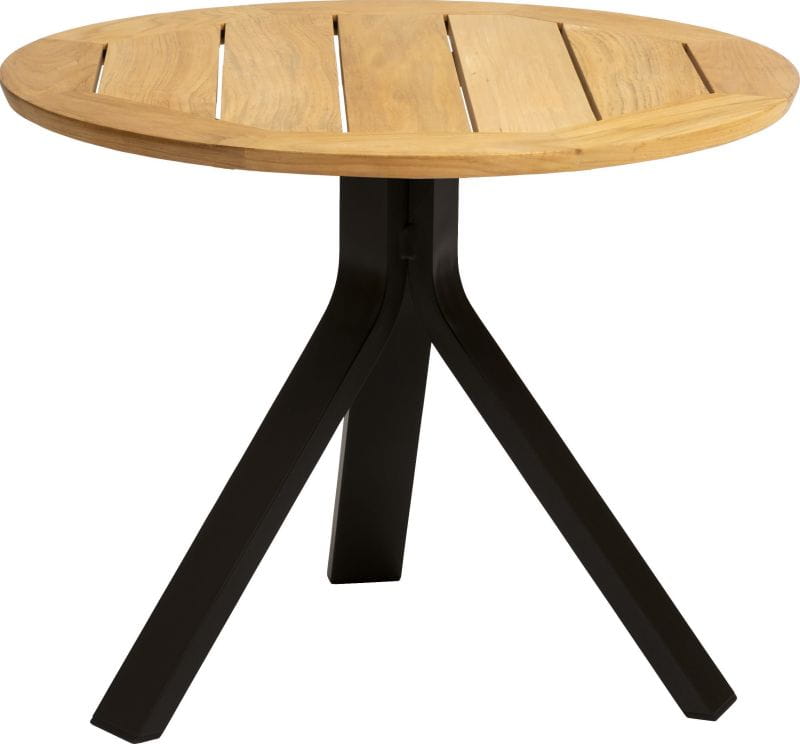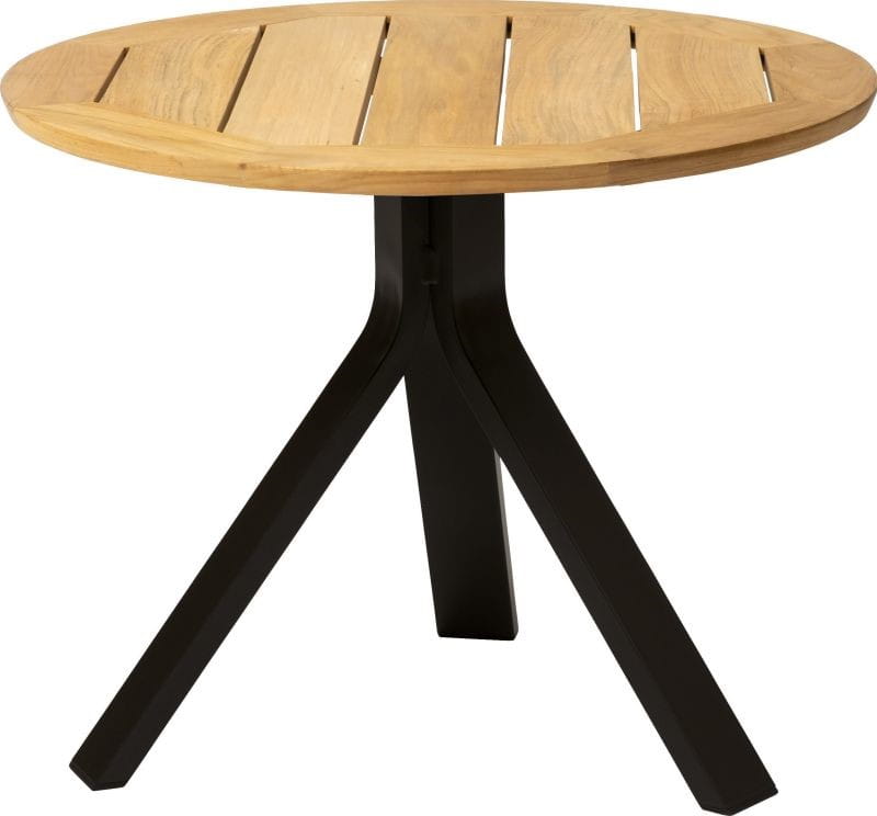 FREDDIE mały stolik ogrodowy. Doskonały stolik do wykorzystania na balkonie, tarasie, w ogrodzie lub oranżerii. Rama aluminiowa w kolorze czarnym matowym, Blat z drewna Teakowego.