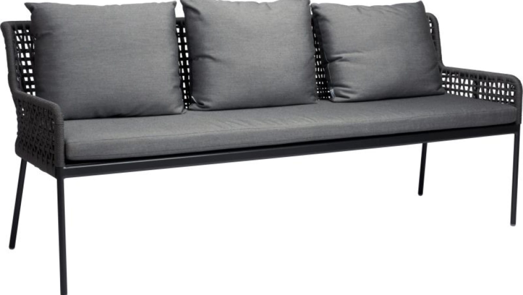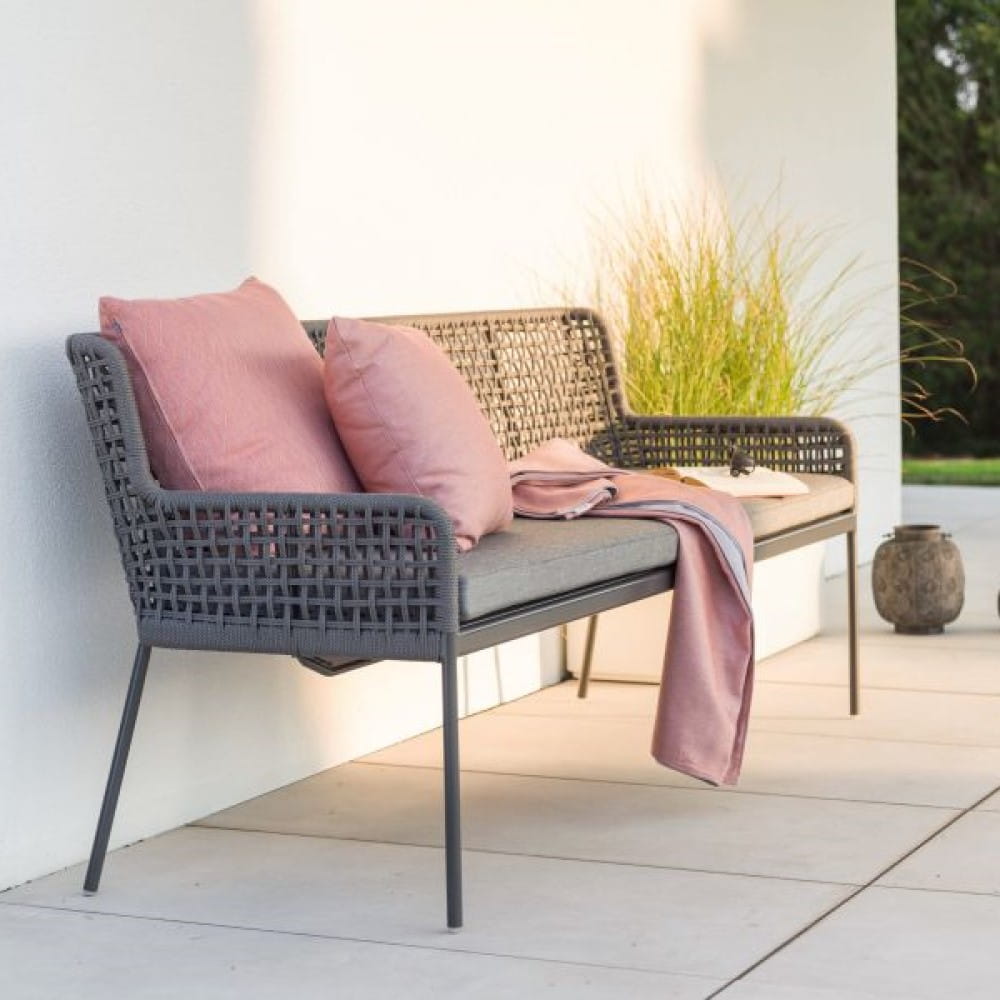 GRETA Ławka w kolorze szarego jedwabiu do wnętrz lub ogrodu. Meble z kolekcji GRETA są ręcznie wyplatane z syntetycznego sznurka na aluminiowych ramach malowanych proszkowo. Meble odporne na działanie niekorzystnych czynników atmosferycznych, zaprojektowane z myślą o wykorzystaniu ich na zewnątrz bez względu na warunki pogodowe.
