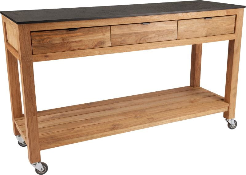 HILDA to konsola ogrodowa wykonana z drewna teakowego z czterema szufladami i półką. Doskonała do przechowywania najpotrzebniejszych rzeczy.  Blat SilverStar 2.0
