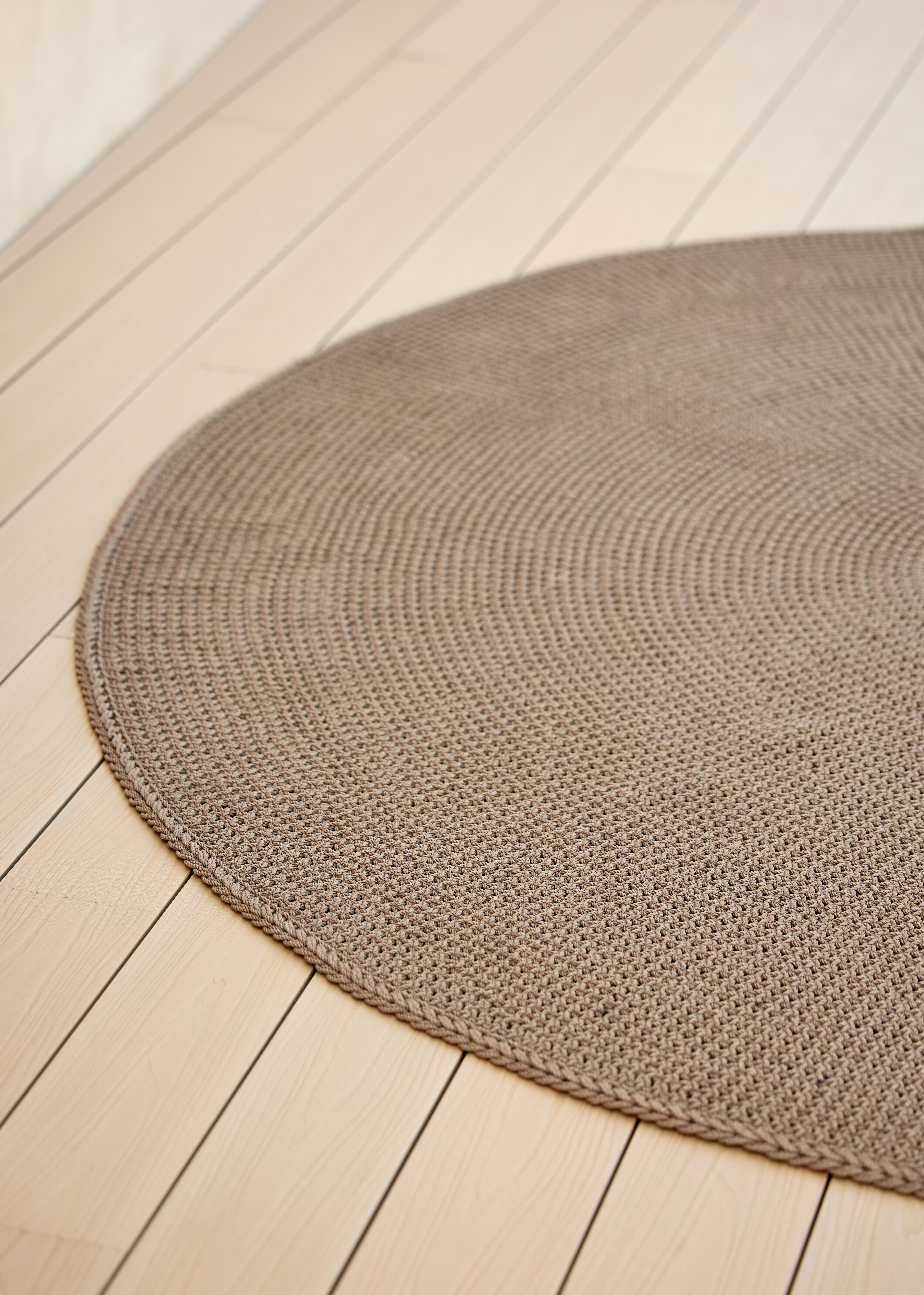 KNIT CARPET dywan ogrodowy o średnicy 200 cm. Kolor: Dark Sand. Zmień swój taras w letni salon! Dywany dzianinowe wykonane są z nowatorskiego włókna Cane-line SOFT ROPE®, Połączenie włókien Selected PP z plecionką Cane-line (termoplastycznych włókien). Ten materiał jest odporny na promieniowanie UV jak i deszcz, miły w dotyku, praktyczny i trwały. Są łatwe w czyszczeniu przy użyciu letniej wody i szczotki. Producent dopuszcza niewielkie różnice w wykonaniu poszczególnych egzemplarzy z uwagi na ręczne wykonanie produktu.