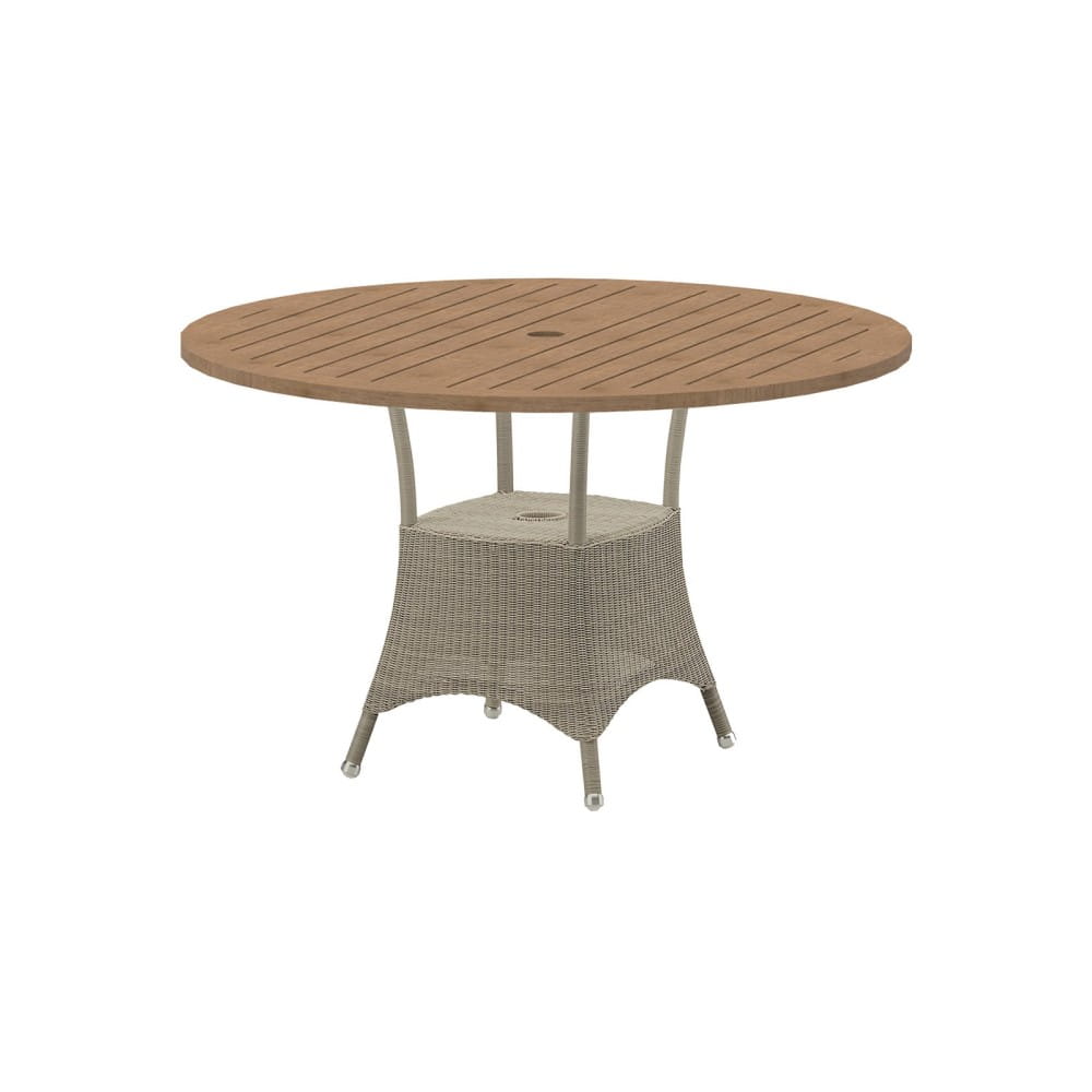 LANSING stół ogrodowy kolorze Taupe plecionki Cane-line WAVE®. Okrągły blat stołu z egzotycznego drewna TEAK