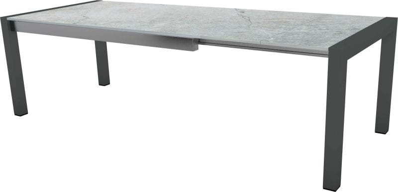 Ekskluzywne stoły z ceramicznymi blatami Dekton do wyboru w dwóch kolorach  na aluminiowej podstawie w kolorze anthracite. Stół rozkładany z jedną dostawką z boku stołu.