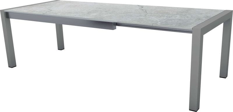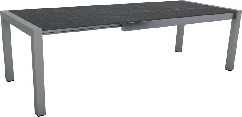 Ekskluzywne stoły z ceramicznymi blatami Dekton do wyboru w dwóch kolorach na aluminiowej podstawie w kolorze graphite. Stół rozkładany z jedną dostawką z boku stołu.